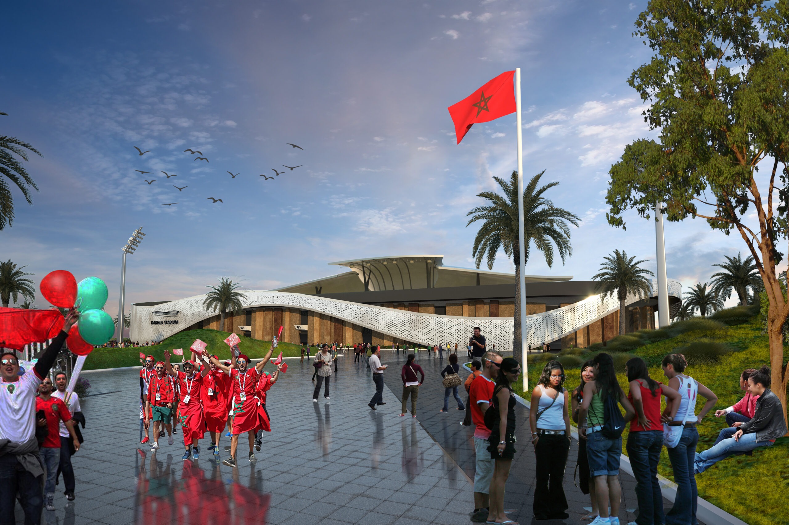 Le nouveau stade de Dakhla est un bâtiment fort de la ville. Il se veut être le point de convergence entre nature et technologie. La forme générée impacte le projet physiquement par la prestance architecturale qui renvoie l’image d’un projet technologique à la hauteur des attentes du maître d’ouvrage, mais aussi psychologique puisque les lignes de force générales du volume invitent à la découverte et induisent une dynamique qui rassure et met en condition les usagers.
