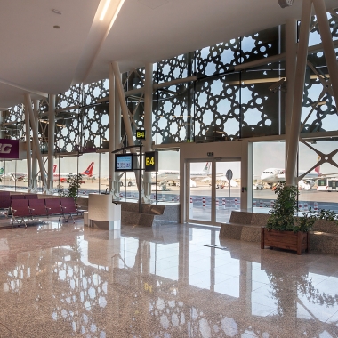 Avec la grande attention de ne pas verser dans le mimétisme traditionnel, un grand soin a été accordé à la réinterprétation des motifs de la double peau, des zelliges, des plâtres, dans le but d’inscrire l’aérogare dans un contexte marocain avant-gardiste. L’aéroport de Marrakech est un projet dont les fondamentaux conceptuels et constructifs s’inscrivent dans la logique du développement durable, avec un traitement en double peau, des vitrages à faible émissivité, un système de récupération des eaux au niveau de la toiture… de manière à optimiser les apports énergétiques naturels, en vue d’économie d’exploitation.