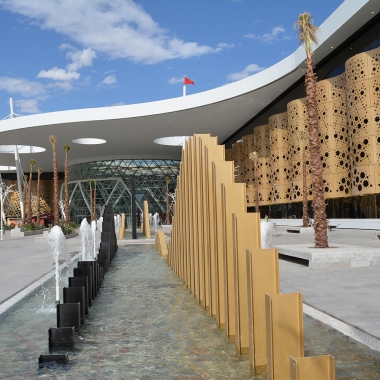 Pour répondre aux exigences structurelles, tout en respectant le concept de légèreté, l’équipe s’est attelée à dévier la contrainte de dimensionnement, en proposant des structures tripodes retro-éclairées, et intégrant des toiles tendues, en référence aux couleurs de la ville ocre de Marrakech.