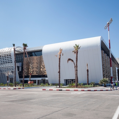 La particularité de l’aéroport de Marrakech, réside dans sa position au cœur urbain de la ville. L’objectif était donc de le faire participer à la vie quotidienne des riverains, en tant que repère architectural, et espace public, en accordant une attention particulière à l’esplanade. Un dôme de 30 m de hauteur fait office d’articulation par rapport aux parallélépipèdes, qui se déploient, de part et d’autre, comme des ailes, tout en légèreté, évoquant l’envol et le mouvement.