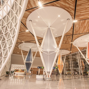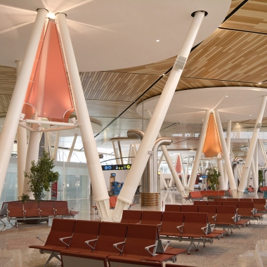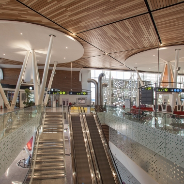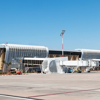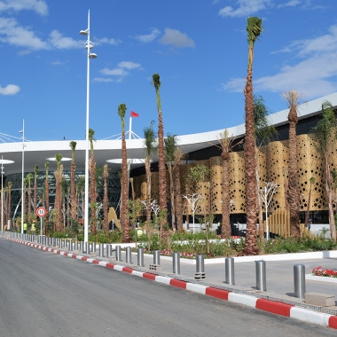 Avec la grande attention de ne pas verser dans le mimétisme traditionnel, un grand soin a été accordé à la réinterprétation des motifs de la double peau, des zelliges, des plâtres, dans le but d’inscrire l’aérogare dans un contexte marocain avant-gardiste. L’aéroport de Marrakech est un projet dont les fondamentaux conceptuels et constructifs s’inscrivent dans la logique du développement durable, avec un traitement en double peau, des vitrages à faible émissivité, un système de récupération des eaux au niveau de la toiture… de manière à optimiser les apports énergétiques naturels, en vue d’économie d’exploitation.