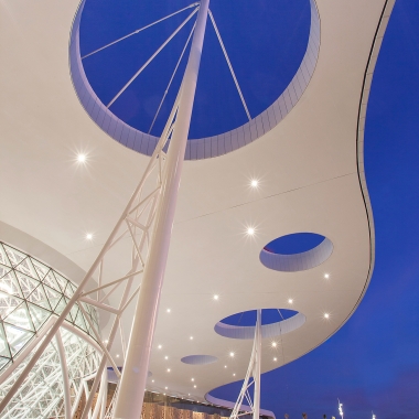 La structure et la lumière sont ici, au service de l’architecture, pour des ambiances spatiales fidèles à l’identité locale, avec des aspirations contemporaines, dans une dominante de couleur blanche. Les toiles tendues colorées, les zelliges, le contraste des matériaux mats et brillants, ainsi que l’ombre projetée par la tôle perforée, créent des atmosphères différentes tout le long de la journée.